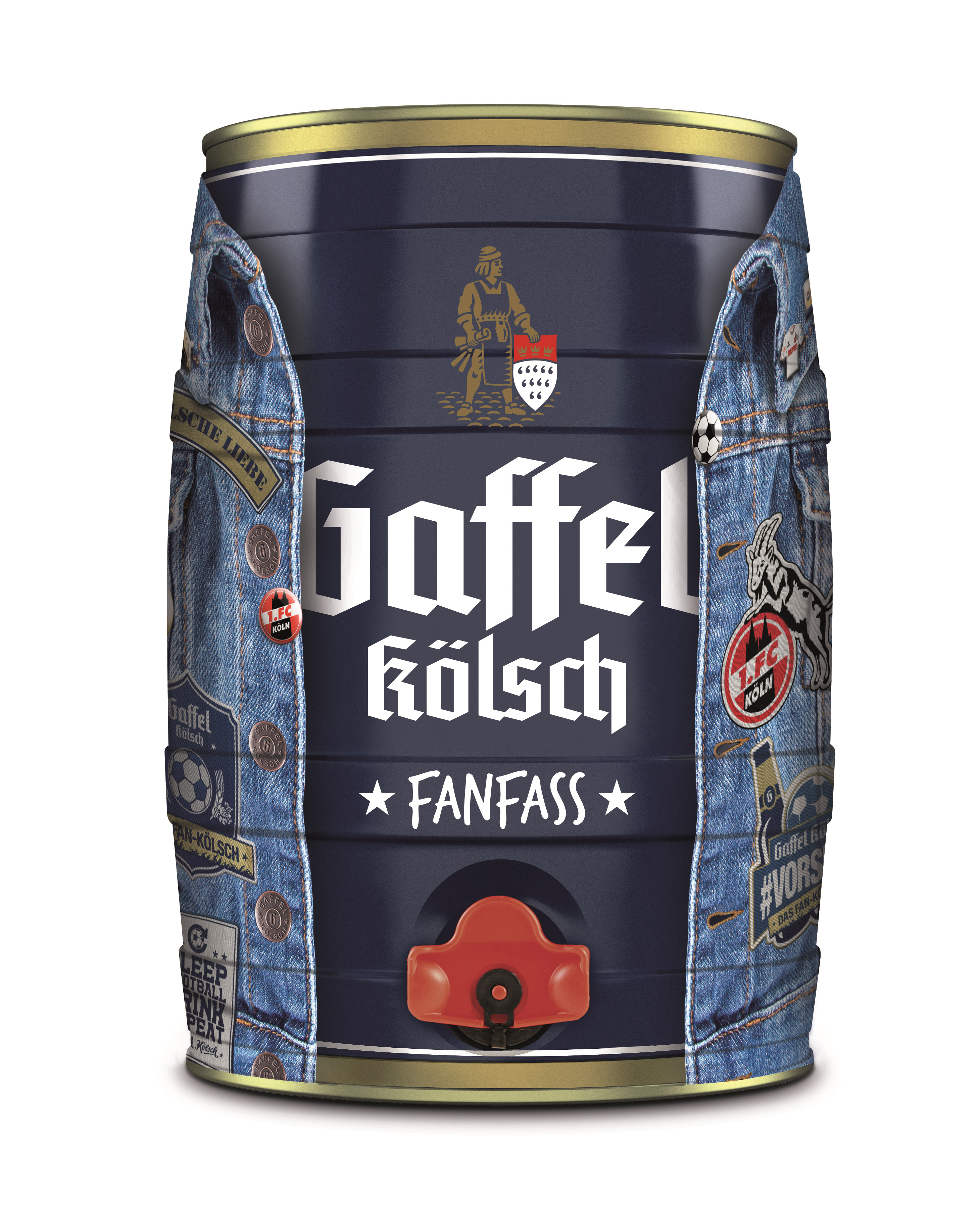 Das neue 5-Liter FC-Partyfässchen hat die Anmutung einer Fußball-Kutte, die das klassische Gaffel Kölsch-Partyfässchen kleidet. Auf dem animierten Jeansstoff befinden sich zahlreiche Aufnäher mit FC-Symbolen und Fan-Stickern.